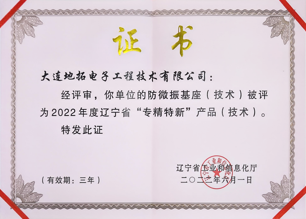 公司是国家高新技术企业、国家知识产权优势企业、辽宁省“专精特新”中小企业、辽宁省瞪羚企业、大连市半导体行业协会第四届理事会会员、防微振设备被评为辽宁省“专精特新”产品。